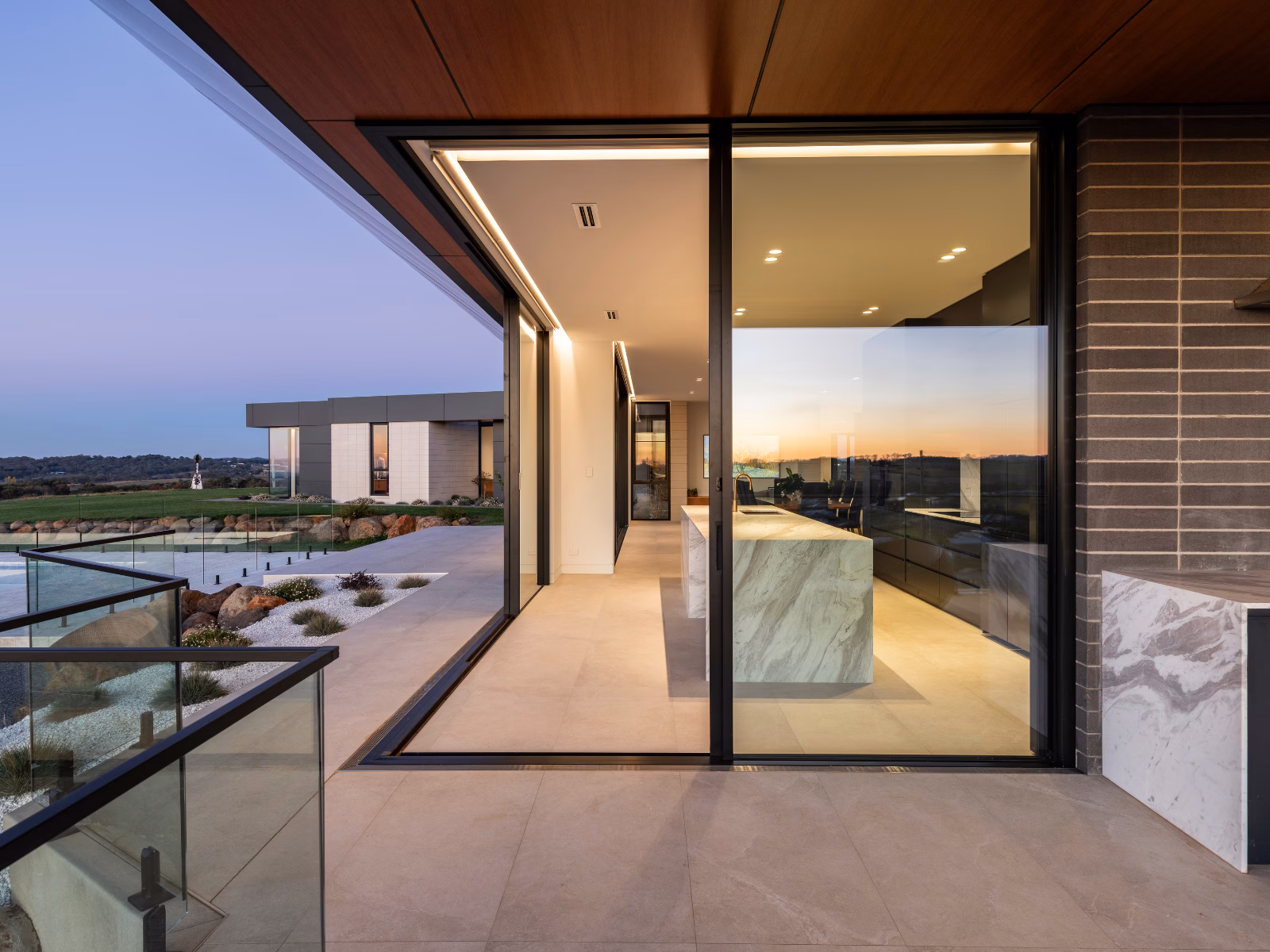 The use of the Series 704B SlideMASTER™ Sliding Door in various applications made this design vision possible. A corner installation of the Series 704B by the kitchen allows fresh air to fill the house while cooking, simultaneously providing an uninterrupted view outside. The Series 450 Wide Gap Double Glazed CentreGLAZE™ Framing enabled the inclusion of larger IGUs (40mm), essential to maintaining thermal efficiency throughout the home when using such large spans of glass.