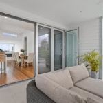 The lower level features the Series 704FBR SlideMASTER™ Sliding Door along the rear wall, creating a harmonious flow between the indoors and maximising the opening to the outdoor deck and in-ground swimming pool.
