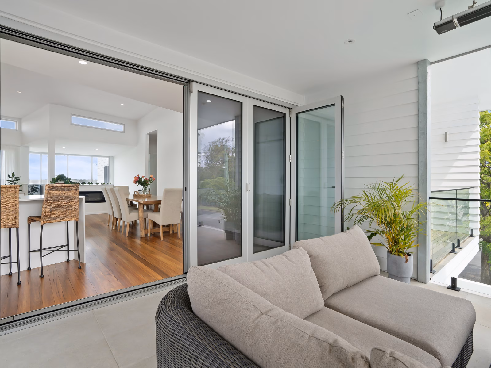 On the second level, Series 831 Thermally Broken Bi-Fold Doors are installed at the balcony to provide balcony access forming a connection between the balcony, dining room, and kitchen. With their generous openings, these doors invite an abundance of natural light and a gentle breeze from the ocean to keep you cool and fresh while entertaining or cheffing away in the kitchen.