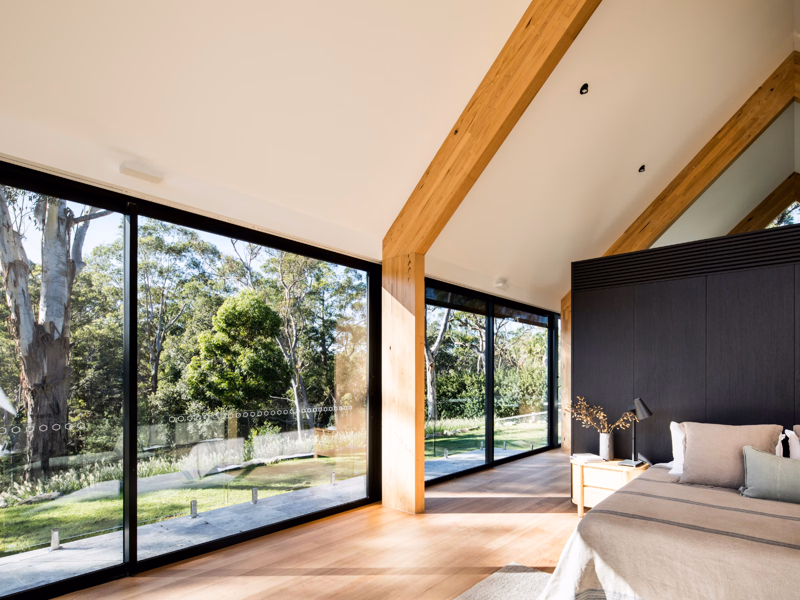 In an innovative application, Series 704B SlideMASTER™ Sliding Doors were installed along the side of the house, with multiple 2-panel doors lined up to open onto the bushland. To meet the required safety standards, a glass railing was included across