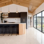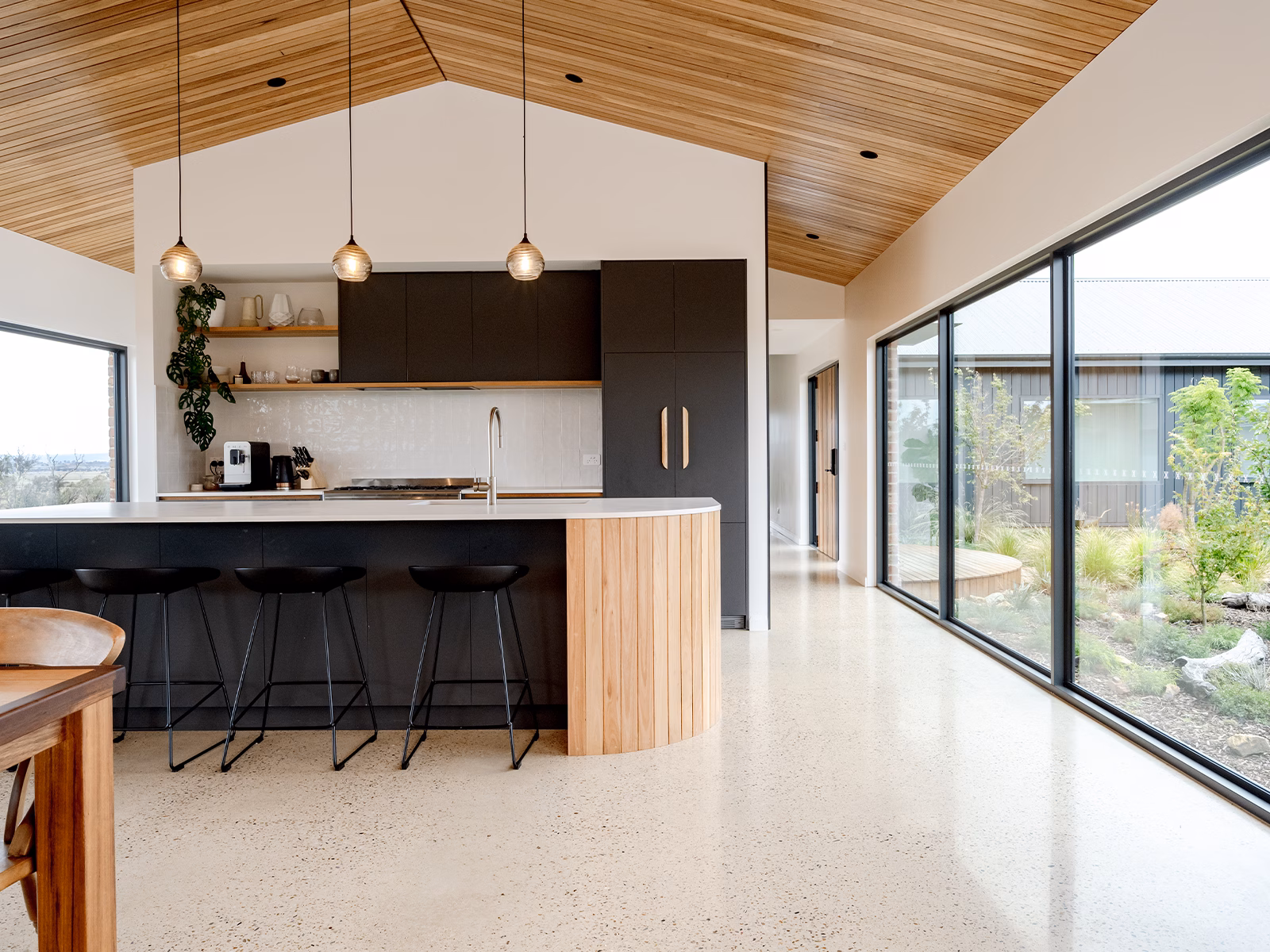 The result is visually striking and architecturally innovative, with an open-plan layout where the large windows maximise natural light and views of the surrounding landscape. It’s a comfortable and sustainable home with an enduring connection to the natural world, and a perfect setting for Sam and Selina to enjoy life with their family.